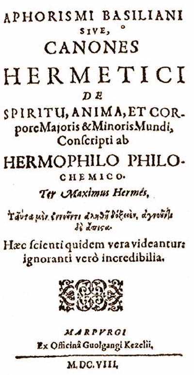 [7] Come abbiamo visto il frontespizio recita testualmente: "...cum interpretis aphorismis Basilianis et praefatione philosophica". Sarebbe dunque il traduttore delle due operette di Basilio Valentino l'Hermophilo Philochemico autore degli aforismi. Faremo tra beve qualche ipotesi sull'identità del misterioso personaggio.
